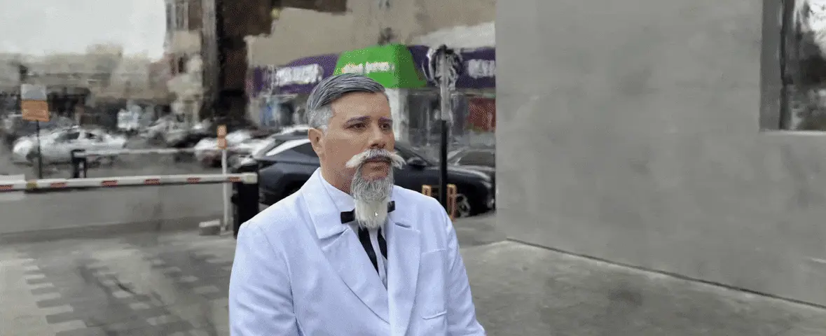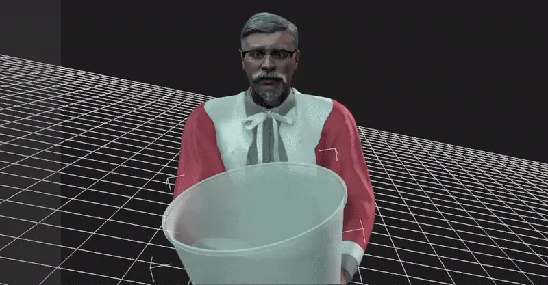 Далее мы создали MetaHuman-персонажа. На основе скана мы собрали цифровую копию, стилизованную под Полковника Сандерса. Мы добавили усы, бороду и подготовили риг для анимации.
