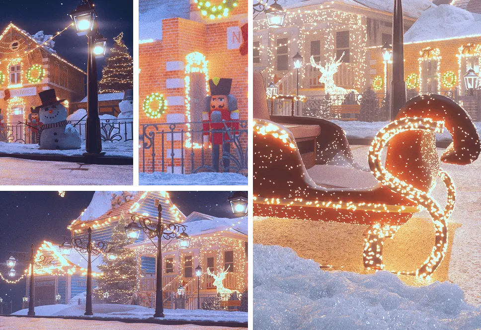 Мы добавили лёгкую симуляцию снега. Частицы выходят за экран и усиливают эффект глубины. Таким образом, анаморфный эффект стал ещё ярче.